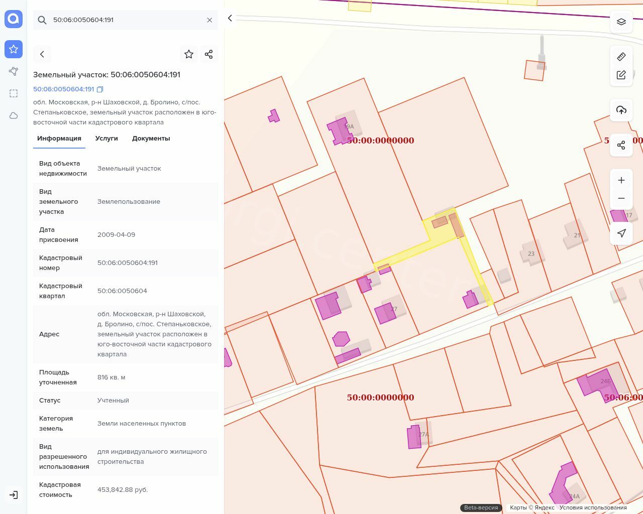 Земельный участок, категория земель: земли населенных пунктов, виды разрешенного пользования - для индивидуального жилищного строительства, кадастровый номер 50:06:0050604:191, площадь 816 кв.м. Адрес: местоположение установлено относительно ориентира, расположенного в границах участка. Почтовый адрес ориентира: обл. Московская, р-н Шаховской, д. Бролино, с/пос. Степаньковское, земельный участок расположен в юго-восточной части кадастрового квартала