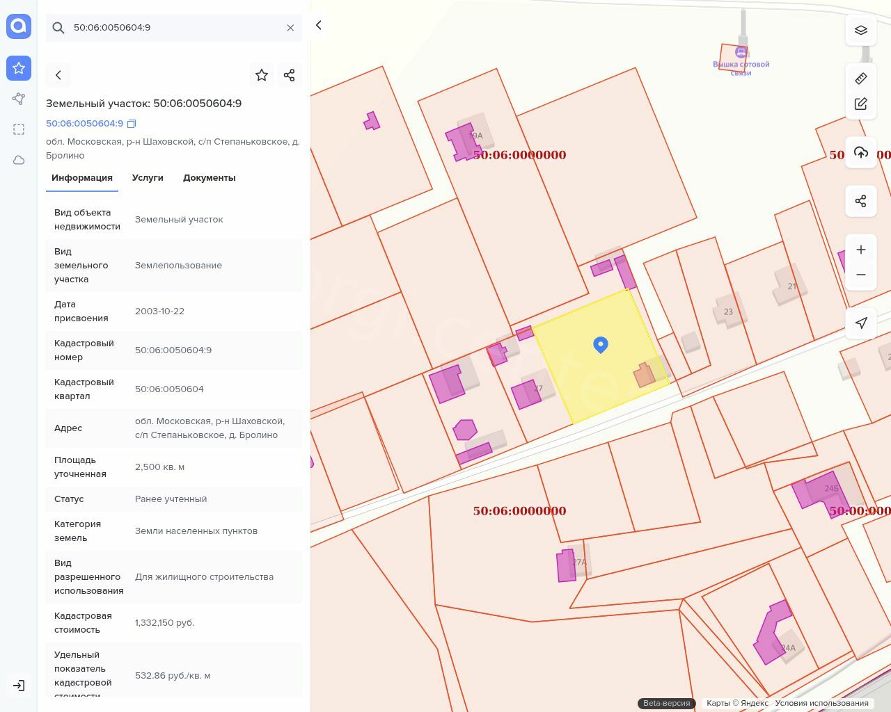 Земельный участок. Для жилищного строительства, Кадастровый номер: 50:06:0050604:9, Площадь: 2500 кв.м. Адрес: местоположение установлено относительно ориентира, расположенного в границах участка. Почтовый адрес ориентира: обл. Московская, р-н Шаховской, с/п Степаньковское, д. Бролино