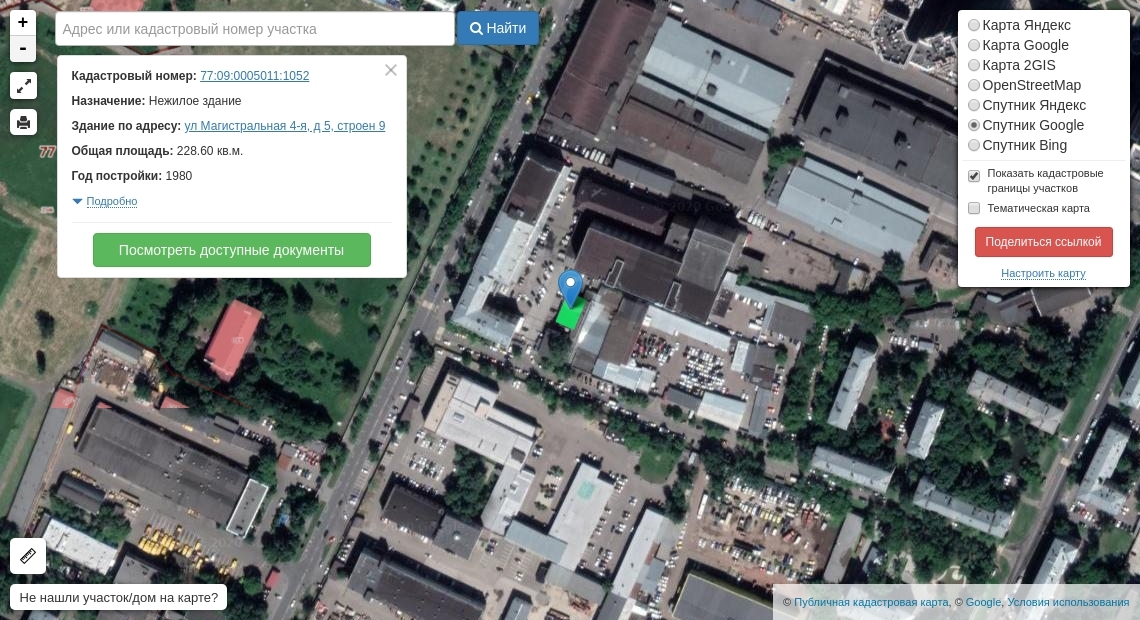 Здание, назначение: нежилое, этажность: 1, общая площадь 228,6 кв. м, кадастровый № 77:09:0005011:1052, Адрес: Российская Федерация, г. Москва, вн.тер.г. муниципальный округ Хорошевский, ул. 4-я Магистральная, д. 5, стр. 9;