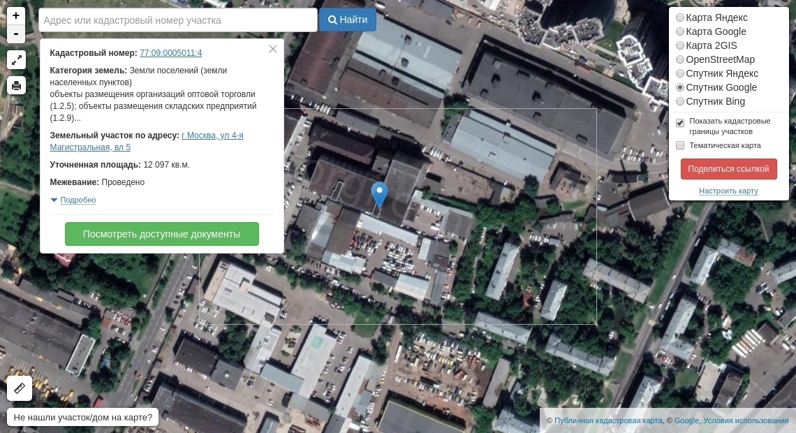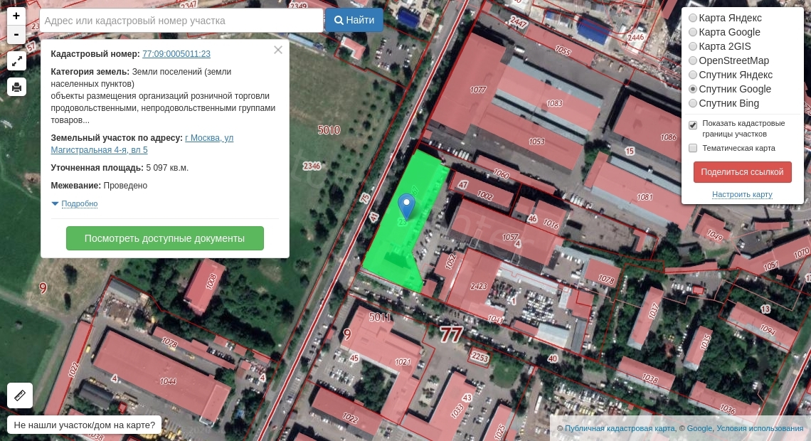 Право аренды земельного участка, категория земель: земли населенных пунктов, разрешенное использование: объекты размещения организаций розничной торговли продовольственными, непродовольственными группами товаров (1.2.5); объекты размещения организаций оптовой торговли (1.2.5); объекты размещения коммерческих организаций, не связанных с проживанием населения (1.2.7); объекты размещения складских предприятий (1.2.9), общая площадь 5 097 кв м, кадастровый № 77:09:0005011:23, Адрес: г. Москва, ул. 4-я Магистральная, вл. 5.