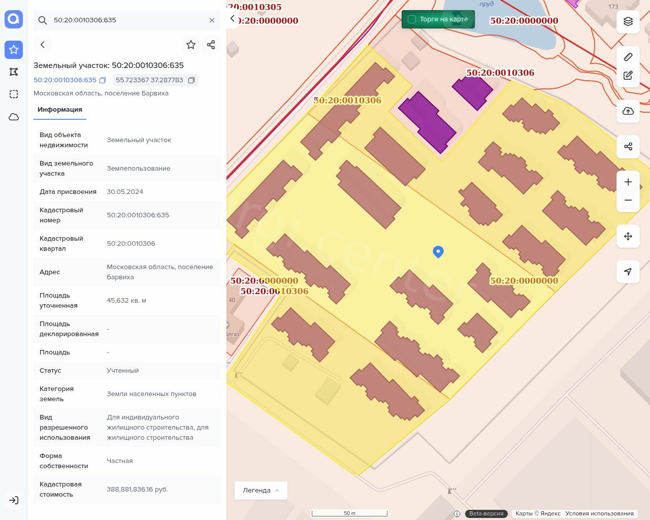 Земельный участок кад. № 50:20:0010306:635 с объектами незавершённого строительства (степень готовности незавершенного строительства указана в процентах через запятую после площади объекта), на нём расположенными с кадастровыми номерами: 50:20:0010306:275 (S=2227,6 кв.м., 44% готовность);