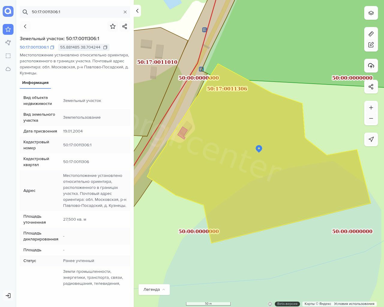 Земельный участок. Категория земель: Земли промышленности, энергетики, транспорта, связи, радиовещания, телевидения, информатики, земли для обеспечения космической деятельности, земли обороны, безопасности и земли иного специального назначения. Кадастровый номер: 50:17:0011306:1. Доля владения: 1/1. Площадь: 27 500 кв.м.