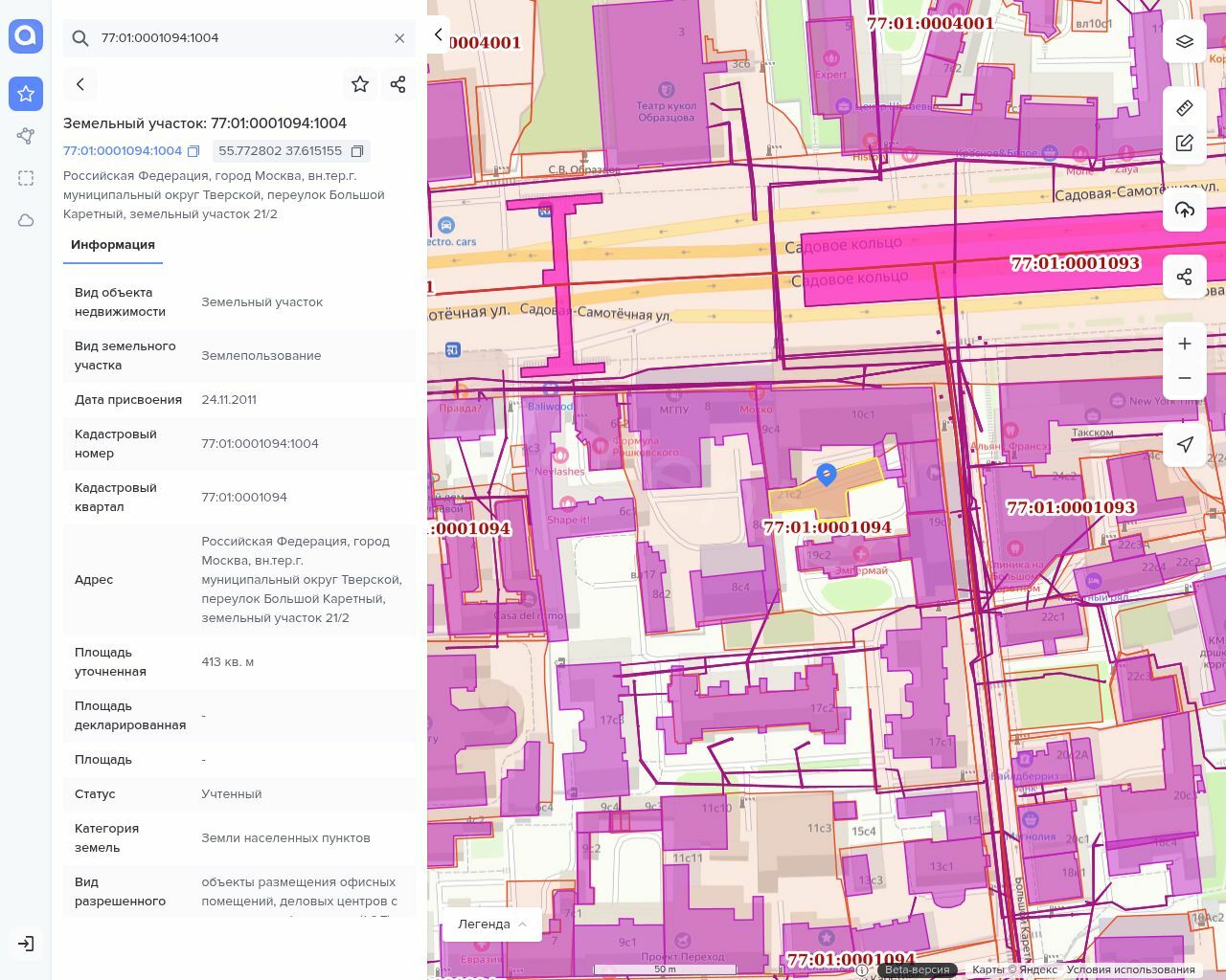 Земельный участок площадью 413 кв.м, с кадастровым номером 77:01:0001094:1004. Адрес: г. Москва, Большой Каретный пер., вл. 21, стр. 2
