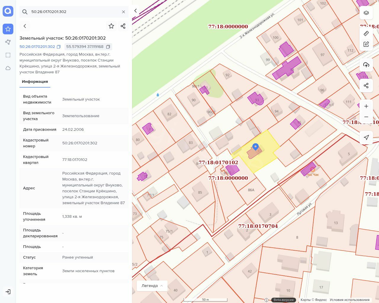 Земельный участок, кад. №50:26:0170201:302, площадью 1338 +/-13 кв. м, для ведения личного подсобного хозяйства Адрес: г. Москва, поселение Марушкинское, ст. Крекшино, ул. 2-я Железнодорожная, уч. 87