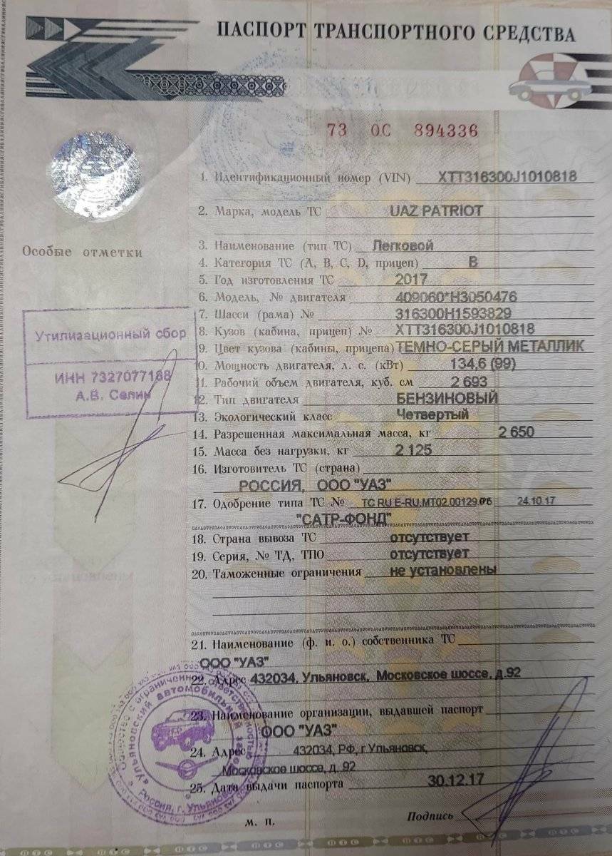 УАЗ Patriot, гос. № Н003УТ11, VIN XTT316300J1010818, 2017 года выпуска, пробег 230 000 км, не на ходу. Мощность, л.с.(по ПТС): 134