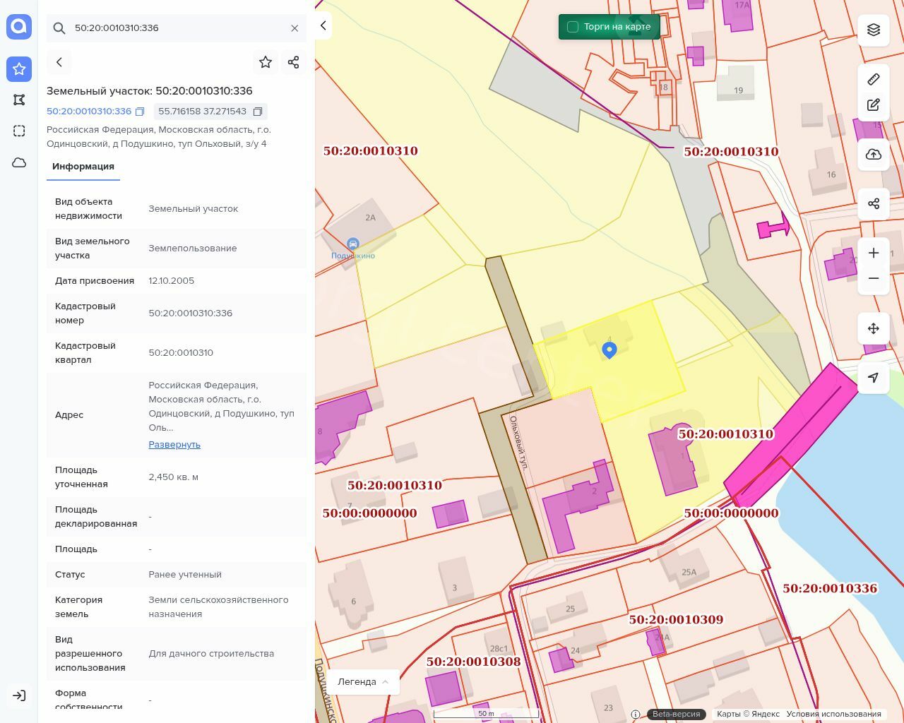 Земельный участок, кадастровый (условный) номер 50:20:0010310:336, площадь 2450,00 кв.м. Адрес: Россия, обл. Московская, р-н Одинцовский, дер. Подушкино, Одинцовский тупик