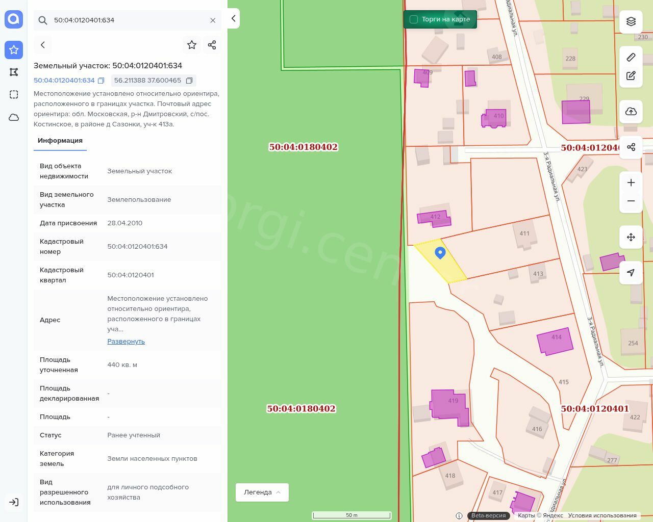 Лот №2. Земельный участок, площадь 440 кв.м., назначение: Земли населенных пунктов, кадастровый (условный) номер: 50:04:0120401:634.