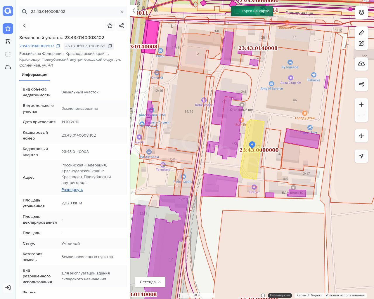 Нежилое здание площадью 1 303,5 кв.м. с кадастровым номером 23:43:0140008:199, Земельный участок площадью 2 023 кв.м. с кадастровым номером 23:43:0140008:102, земли населенных пунктов, для эксплуатации здания складского назначения